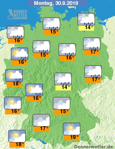 Am Montag ist es im Süden oft aufgelockert, teils stark bewölkt und dabei überwiegend trocken. Im großen Rest der Republik ziehen größtenteils viele und oft dichte Wolken durch, dazu fällt zeitweise Regen. Die Temperatur steigt auf 14 Grad in Neubrandenburg und bis 19 Grad in Augsburg.