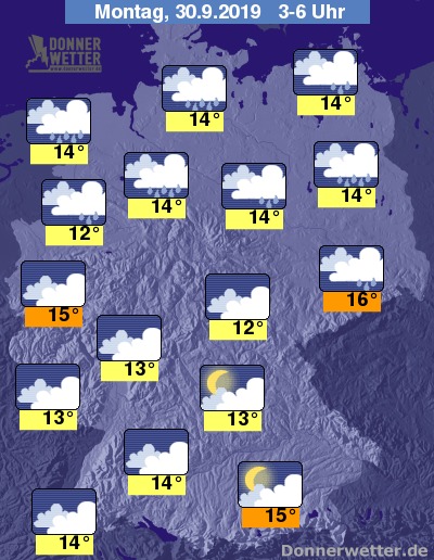 In der Nacht zum Montag bleibt es nördlich der Mainlinie weitestgehend bedeckt und es fällt verbreitet zeitweise Regen. Im Süden ist es auch teils stark, teils aber auch aufgelockert bewölkt, hier bleibt es weitgehend trocken. Die Temperatur sinkt auf 16 Grad in Dresden und bis 12 Grad in Ilmenau.