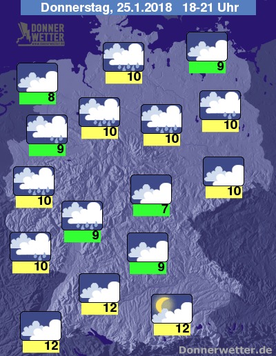Bis zum Abend zieht das Regenband, das uns schon den ganzen Tag begleitet, weiter nordostwärts, sodass die Niederschläge nun auch im Norden an Intensität gewinnen. Insbesondere südlich dieses Regenbandes bleibt es jedoch weiterhin trocken, aufgrund dichter Wolken zeigt sich die Sonne jedoch kaum einmal.