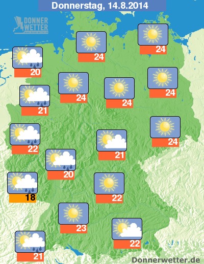 Am morgigen Donnerstag starten wir meist freundlich mit Sonnenschein in den Tag. Im Laufe des Tages ziehen von Westen jedoch dichtere Wolken auf und vor allem am Nachmittag können sich hier und da Schauer, örtlich auch Gewitter entwickeln. Meist trocken bleibt es im Osten und Südosten des Landes. Die Temperaturen steigen auf 18 Grad im Pfälzer Wald und 24 Grad im Osten der Republik.