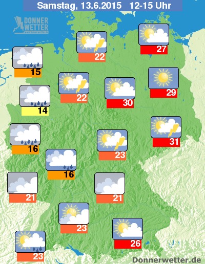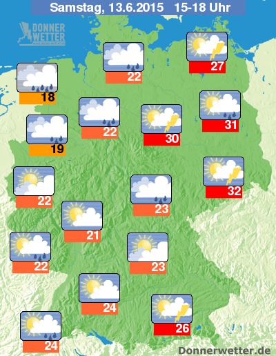 Die Temperaturen liegen dann bei Werten um 18 Grad C im Nordwesten und schwül-heißen 32 Grad in Sachsen.