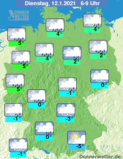 Der Dienstag startet bis auf einzelne Auflockerungen am Alpenrand überwiegend bedeckt. Immer wieder muss dabei mit teils auch kräftigeren Niederschlägen gerechnet werden, die in tiefen Lagen als Regen oder Schneeregen, in den Mittelgebirgen zumeist als Schnee falllen.