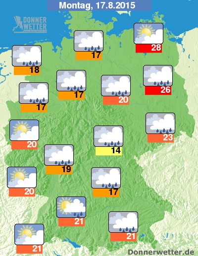 Im Einheitsgrau steigen die Temperaturen heute auf maue 14 Grad C im Thüringer Wald und sommerliche 28 Grad C in Mecklenburg-Vorpommern.