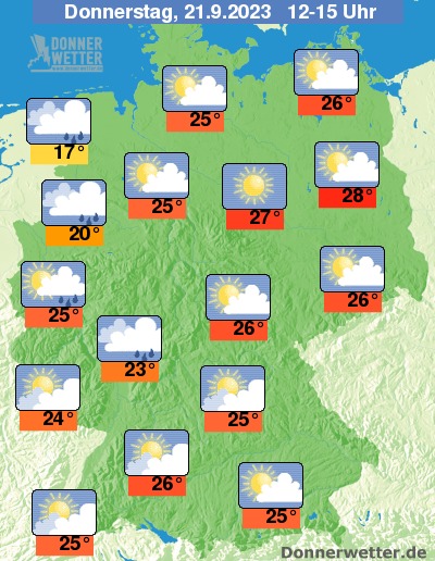 Heute Nachmittag ist es über der Osthälfte Deutschlands überwiegend heiter bis sonnig, dabei bleibt es trocken. Weiter nach Westen hin ziehen mehr und mehr dichte Wolken auf und nachfolgend fällt auch Regen. Die Temperatur liegt bei 17 Grad an der Nordsee und 28 Grad an der Oder.