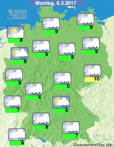 Heute bleibt es über dem Land größtenteils bedeckt, es sind hier und da auch mal, meist jedoch nur kurze Auflockerungen möglich. Dazu fällt verbreitet immer wieder Regen bei Höchstwerten von 5 Grad im Grabfeld und bis 10 Grad in Dresden.