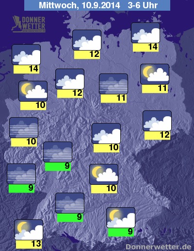 In der kommenden Nacht können sich am Nordrand der Alpen, sowie im Ostseeumfeld einzelne Schauer und Gewitter bilden, in den anderen Landesteilen zieht dagegen meist nur lockere bis aufgelockerte Bewölkung durch, nur selten halten sich dichte Wolken, besonders nach Südwesten hin ist es auch häufig klar, dabei bleibt es trocken. Es bildet sich stellenweise Nebel oder Dunst. Die Temperatur sinkt auf 14 Grad in Rostock und etwa 9 Grad im Kraichgau.