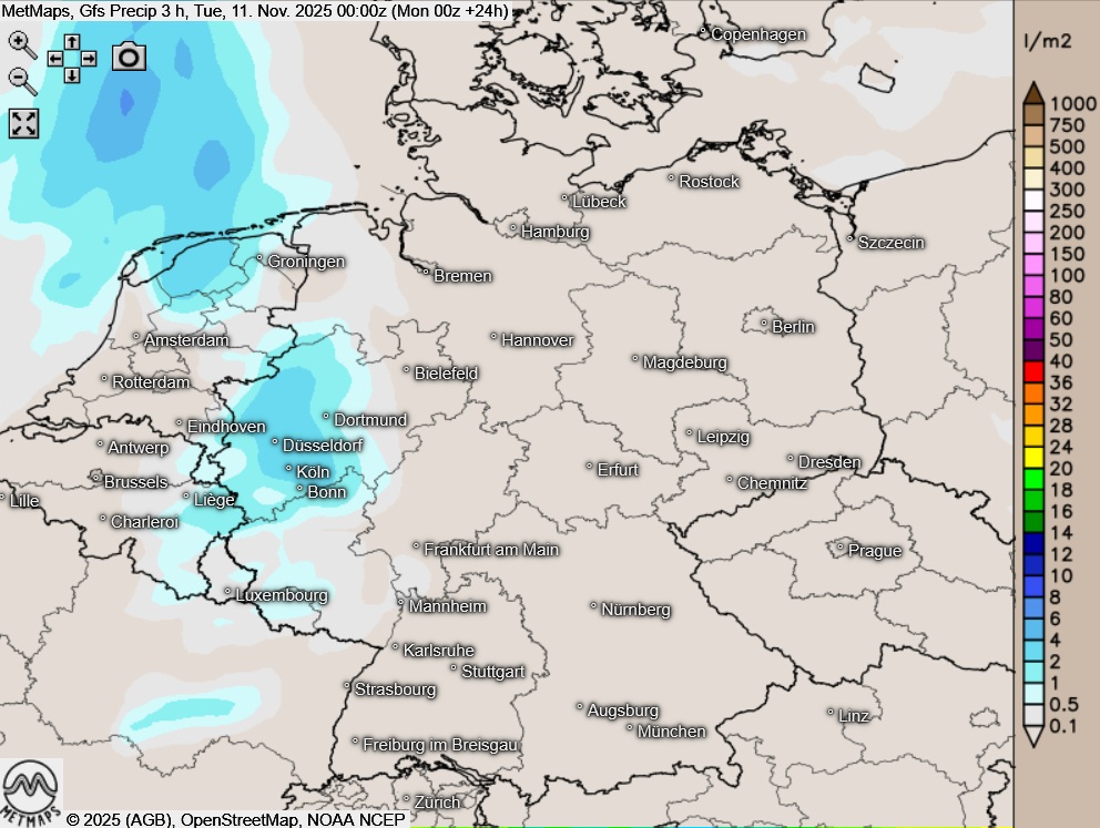 Am Montagnachmittag nimmt die Bewölkung von Westen her zu, zum Abend hin setzt dann leichter Regen ein. In den übrigen Landesteilen bleibt es über die Nachmittagsstunden teils nebelig-trüb, teils ist es aufgelockert bewölkt und es bleibt weitgehend trocken.