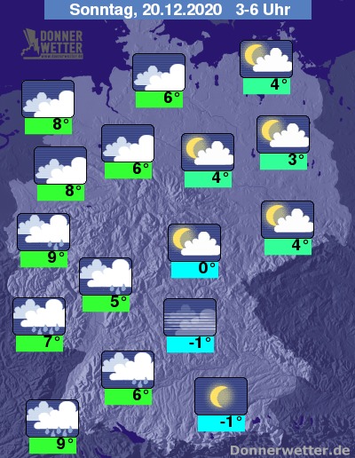 In der Nacht zum Sonntag zeigt sich der Himmel über der Osthälfte des Landes meist locker bis wechselnd bewölkt, nach Südosten hin mehrheitlich sogar sternenklar, dazu bleibt es trocken, stellenweise ist Nebel möglich. Weiter nach Westen hin halten sich dichte Wolken und im Westen und Südwesten fällt gebietsweise Regen, sonst bleibt es trocken. Die Temperatur sinkt auf 9 Grad im Oberrheingraben und -1 Grad in Berchtesgaden.