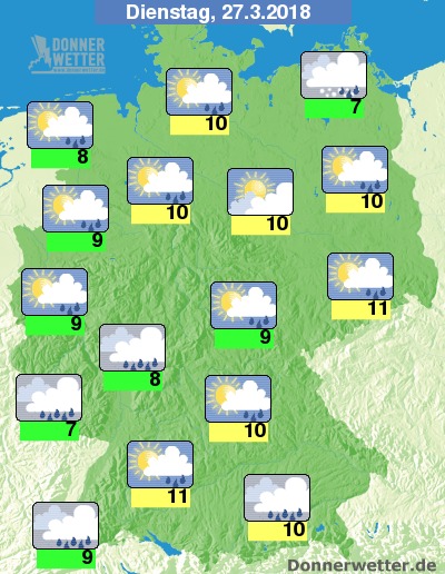 Während es anfangs noch zu größeren Aufheiterungen kommt, bilden sich bis Mittag im Osten wieder örtliche Schauer, die in den Hochlagen auch als Schnee fallen können. Gleichzeitig trübt sich der Himmel im Westen mit dichten Schichtwolken ein und mit auffrischendem Südwestwind setzt bald darauf Regen ein. Die Höchsttemperaturen liegen meist zwischen 6 und 12 Grad. Kühler bleibt es in den Mittelgebirgen und an der Ostseeküste. In der Nacht auf Mittwoch erreicht der Regen auch die östlichen Bereiche. Von Westen rücken einzelne Schauer nach.