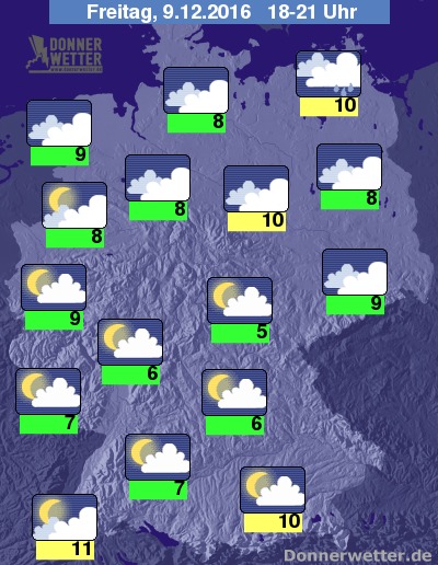 Nach dem verregneten Start in den Tag im Norden legen die Niederschläge am Nachmittag eine Pause ein. Dennoch verdecken nach wie vor dichte Wolken die Sonne, diese zeigt sich lediglich im Süden. Bis zum Abend kommen im Schwarzwald und am Alpenrand zahlreiche Sonnenstunden zusammen.