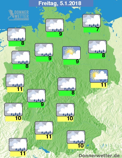 Der Freitag beschert uns dann erneut landesweit Regen. Bei nach wie vor kräftigem Wind steigen die Höchstwerte auf bis zu 7 Grad an der Ostsee und auf milde 11 Grad an Rhein und Donau.