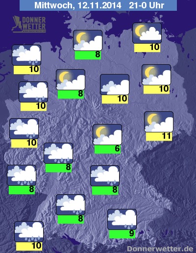 In der Nacht zum Donnerstag klingt der Regen im Nordwesten des Landes meist rasch ab, dazu bleibt es jedoch meist stark bis dicht bewölkt. In der Südhälfte von Deutschland hält sich eine weitgehend dichte Wolkendecke und es fällt zeitweise Regen, sonst ist es größtenteils stark, teils auch aufgelockert bewölkt und trocken. Im Westdeutschland kann sich gebietsweise Nebel oder Hochnebel entwickeln. Die Temperatur sinkt auf 9 Grad in Magdeburg und bis 5 Grad im Steigerwald.