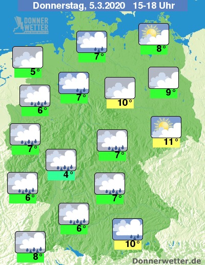 Die Temperaturen bewegen sich zwischen 3 Grad unter den dichten Regenwolken im Rhein-Main-Gebiet und 10 Grad im freundlichen Sachsen.
