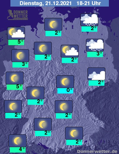 Heute Abend zeigt sich der Himmel über dem Land größtenteils sternenklar. Im Osten und Nordosten hält sich hingegen auch oft dichte Bewölkung, Auflockerungen bleiben dazu eher selten, hier und da sind einige Flocken oder Tropfen möglich, im übrigen Land bleibt es aber trocken. Die Temperatur liegt bei 0 Grad in Erfurt und bis 5 Grad in Köln.
