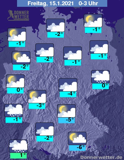 Während der zweiten Nachthälfte beschränken sich einige Schnee- oder Schneeregenfälle auf die Gebiete im Bereich des Erzgebirges und auf den äußersten Südwesten. Sonst gestaltet sich der Himmel im Nordosten und Osten eher wolkenverhangen, im Süden und Westen jedoch teilweise auch aufgeklart.