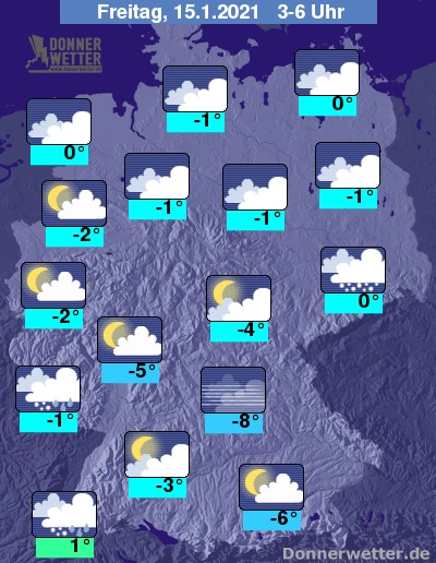 Bis zu den Frühstunden kühlt die Luft verbreitet auf -1 bis -8 Grad ab.