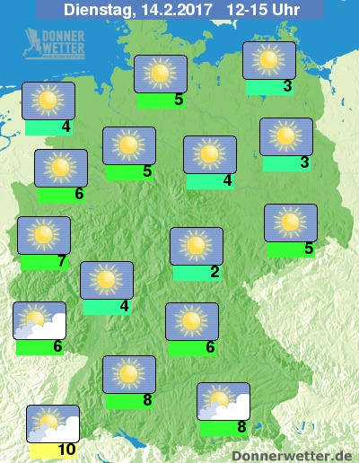 Heute Nachmittag scheint die Sonne von einem verbreitet stahlblauen Himmel. Im Süden hält sich in den Flusstälern noch hier und da Nebel oder es ist neblig-trüb, dabei bleibt es aber trocken. Die Temperatur steigt auf 2 Grad am Thüringer Wald und bis etwa 10 Grad in Freiburg.