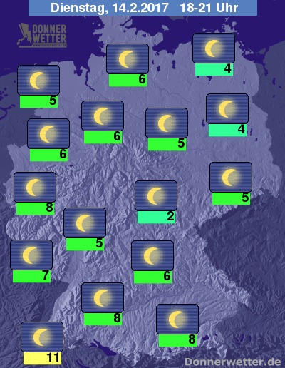 Heute Abend zeigt sich die Bundesrepublik einheitlich sternenklar, dabei bleibt es natürlich trocken. Die Temperatur bewegt sich zwischen 2 Grad im Vogtland und bis 11 Grad im Breisgau.