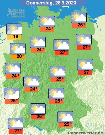 Am Donnerstag zeigt sich das Wetter mehrheitlich heiter oder sonnig. Hier und da können aber auch mal mehr Wolken durchziehen, dabei bleibt es trocken. Die Höchstwerte erreichen 18 Grad an der Nordseeküste und 27 Grad im Oberrheingraben.