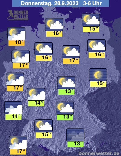 In der folgenden Nacht zeigt sich der Himmel teils sternenklar oder es zieht lockere bis aufgelockerte Bewölkung durch. Bei Tiefstwerten von 18 Grad in Cuxhaven und 13 Grad in Nürnberg bleibt es landesweit trocken.