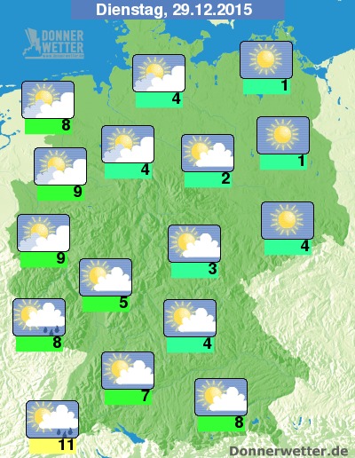 Am Dienstag ist es zunächst verbreitet nur locker bewölkt, im Osten und Nordosten auch teils sonnig. Vor allem in den westlichen Landesteilen ist es eher aufgelockert bewölkt und dazu trocken. Im Tagesverlauf werden die Wolken von Westen her insgesamt zahlreicher und im Westen auch dichter, hier kommt am Nachmittag auch gebietsweise leichter Regen auf, sonst bleibt es trocken. Die Temperatur erreicht nur noch 1 Grad in Berlin und bis 11 Grad in Freiburg. Im Norden teils stürmisch.