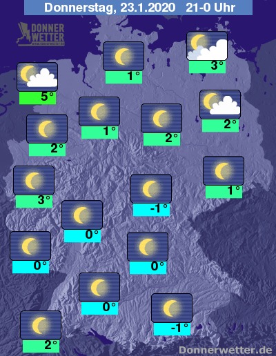 Bis zu den Frühstunden kühlt die Luft auf frostige -6 bis 0 Grad ab und es kann zu Reifglätte kommen. Positive Werte gibt es nur an den Küsten von Nord- und Ostsee.