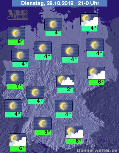 Während der zweiten Nachthälfte fällt in den Alpen stellenweise Niederschlag, sonst bleibt es häufig sternenklar. Lediglich in der Uckermark halten sich teils dichtere Wolkenfelder. Gebietsweise bildet sich Nebel.