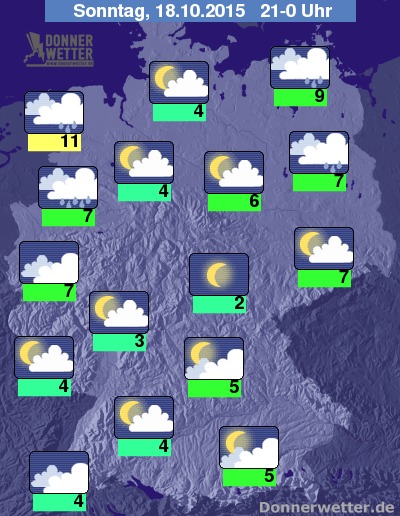 In der Nacht zum Montag ziehen im Norden oft dichte Wolken mit gebietsweise auch etwas Regen durch, auch am Alpenrand ist es oft dichte bewölkt und es fällt gebietsweise Regen. In den anderen Landesteilen zieht hingegen größtenteils lockere oder aufgelockerte Bewölkung durch, teils sind aber auch mal dichte Wolken möglich, dabei bleibt es aber trocken. Die Temperatur sinkt auf 9 Grad an der Wesermündung und bis 0 Grad am Bodensee. Stellenweise bildet sich wieder Nebel oder Hochnebel.