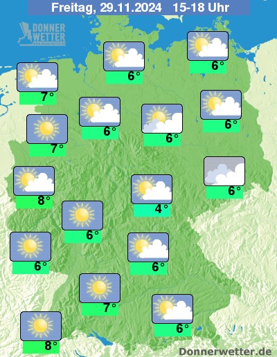 Am Freitagnachmittag zeigt sich der Himmel über der Osthälfe stark bewölkt oder bedeckt, es bleibt aber meist trocken. In den übrigen Landesteilen ist es teils nebelig-trüb, teils kann sich bei Auflockerungen auch mal längere Zeit die Sonne zeigen.