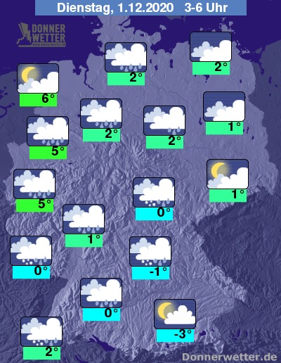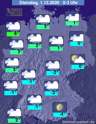 In der Nacht auf Dienstag ist der Himmel über weiten Landesteilen stark bewölkt oder es ist bedeckt und verbreitet muss mit Regen gerechnet werden, der vor allem in der Südhälfte auch als Schneeregen oder Schnee fallen kann. In der Westhälfte ist auch gefrierender Regen möglich. Örtlich besteht eine erhöhte Gefahr vor Straßenglätte! Überwiegend trocken bleibt es in den Nachtstunden meist noch entlang der Oder sowie am Alpenrand.