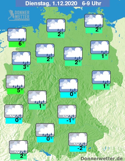 Der erste Dezembertag startet verbreitet grau und nass-kalt - während in der Nordhälfte die Niederschläge bei Werten um 1 bis 6 Grad meist als Regen fallen, ist im Süden auch häufiger Schneeregen oder Schnee bis in tiefere Lagen zu erwarten. Hier am Morgen Werte um -2 bis 2 Grad.