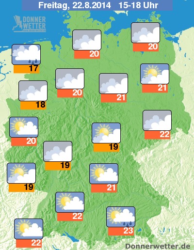 Heute Nachmittag ist es vor allem in der Südhälfte des Landes noch häufig heiter oder aufgelockert bewölkt, dagegen ziehen sonst schon meist viele, gebietsweise dichte Wolken durch, zumeist bleibt es dabei trocken. Im äußeren Norden und Westen, sowie am Alpenrand bilden sich aber Schauer und Gewitter. Die Temperatur liegt bei frischen 17 Grad an der Ems und angenehm warmen 23 Grad in Oberbayern.