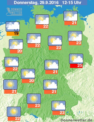 Die Temperaturen erreichen am Nachmittag Werte um 19 Grad C in Emden und um 25 Grad C in Dresden.