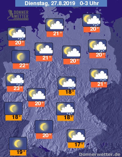 In der Nacht können bei meist geringer Bewölkung zunächst noch über weiten Landesteilen Schauer fallen, überwiegend trocken bleibt es zu diesem Zeitpunkt zwischen Weser und Elbe sowie im äußersten Südwesten.