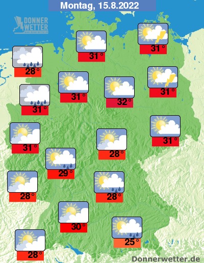 Am Montag zeigen sich teils heitere Abschnitte, teils zieht auch dichte Bewölkung durch, dabei bilden sich lokale Schauer, selten können sich auch Gewitter entwickeln. Die Temperatur erreicht 25 Grad am Alpenrand und bis 32 Grad in der Magdeburger Börde.