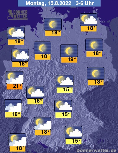 In der Nacht zum Montag klart der Himmel im Norden und Osten der Republik verbreitet auf, dazu bleibt es trocken. Weiter nach Westen und Süden hin ziehen hingegen oft viele und zum Teil auch dichte Wolken durch, dabei bleibt es weitgehend trocken. Die Temperatur sinkt auf 21 Grad in Köln und 15 Grad in Nürnberg.