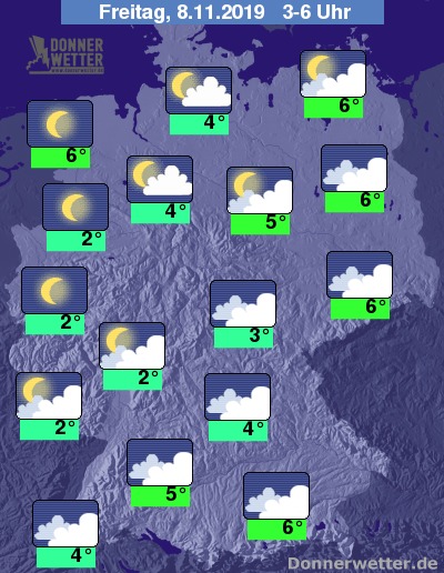 Bis zu den Frühstunden kühlt die Luft auf 1 bis 6 Grad ab. Im Westen besteht die Gefahr von leichtem Bodenfrost.