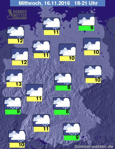 Am Abend ist es in ganz Deutschland weiterhin bedeckt. Dazu kann es vor allem im Nordwesten und im Süden immer wieder zu Schauern kommen. Im Nordosten und im Westen bleibt es überwiegend trocken.