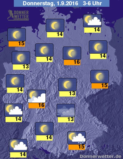 Die Temperaturen sinken im Nachtverlauf auf Werte um 16 Grad C an der Elbe und um 13 Grad C im Münsterland.