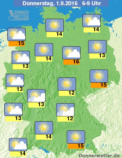 Die Temperaturen liegen am Morgen bei frischen 12 Grad C im Thüringer Bergland und um 15 Grad C in Oberbayern.