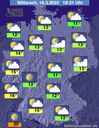 In den Abendstunden zeigt sich der Himmel über weiten Landesteilen locker, am späteren Abend im äußersten Westen und Osten auch wechselnd bis aufgelockert bewölkt. Entlang der Weser und im Südosten klart es im Abendverlauf auf häufig auf. Es bleibt trocken.