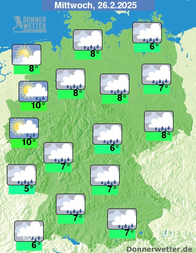 Am Mittwoch bleibt es vor allem über der Osthälfte meist bedeckt und dazu oft sehr verregnet. Weiter nach Westen hin klingen die Niederschläge oft ab oder es bilden sich nur noch einzelne Schauer. Zum Teil kann es im Westen und Nordwesten auch auflockern. Die Temperatur steigt auf 5 Grad am Pfälzer Wald und bis 10 Grad im Rheinland.