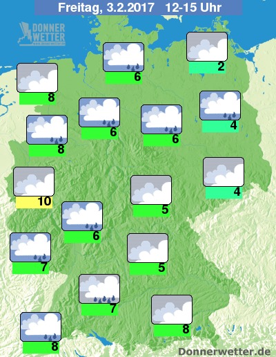 Bereits jetzt hat sich das Regenband über weite Teile der Bundesrepublik ausgebreitet. Wo es zwischen Küsten und Alpen nicht regnet, bedecken dichte Wolken den Himmel. Dabei liegen die Höchstwerte am Nachmittag zwischen 2 Grad an der Ostsee und 10 Grad am Niederrhein.