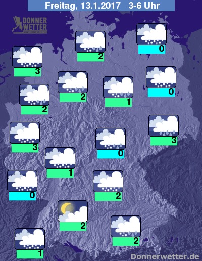 In der Nacht gehen die Niederschläge fast überall in Schnee über. Nur im Nordwesten mischen sich noch Regentropfen darunter. Dazu nehmen die Windgeschwindigkeiten immer mehr zu. Am Morgen ist landesweit mit Sturmböen, in den Kammlagen auch mit Orkanböen, zu rechnen. Die Folge sind Schneeverwehungen und erhebliche Beeinträchtigungen im Berufsverkehr. Die Tiefsttemperaturen liegen bei Werten um den Gefrierpunkt.