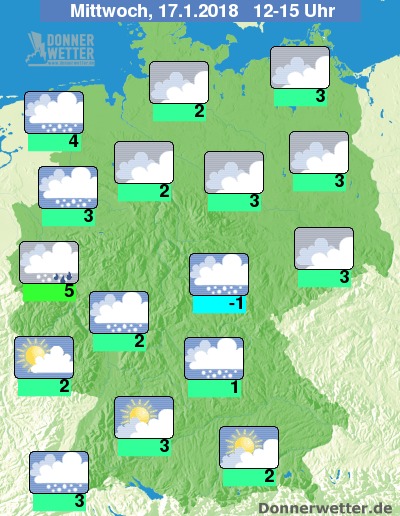 Heute Nachmittag bleibt es über dem Norden und Osten meist stark bewölkt, jedoch weitgehend auch trocken, sonst ziehen überwiegend starke, teils noch aufgelockerte Wolken durch und es bilden sich einzelne Schnee-, Schneeregen- oder Regenschauer. Die Temperatur steigt auf -1 Grad am Thüringer Wald und bis 5 Grad im Rheinland.
