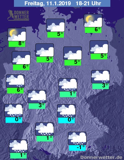 Die Temperaturen liegen in der Südosthälfte zwischen -1 und 3 Grad, in der Nordwesthälfte bei milderen 4 bis 8 Grad.