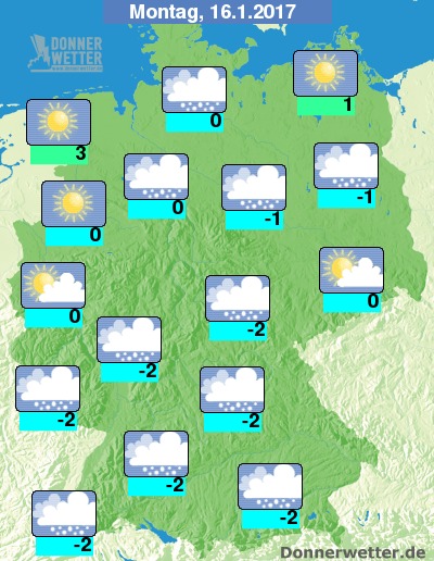 Am Montag ist es im Norden häufig sonnig, hier und da ziehen aber auch mal dichte Wolken mit Schneeschauern durch, sonst ist es hier aber weitgehend trocken. Weiter nach Süden hin ist es dagegen oft stark und zum Teil auch aufgelockert bewölkt, dabei fällt gebietsweise Schnee. Es besteht vielerorts Glättegefahr! Die Temperatur erreicht Werte zwischen -2 und 3 Grad.