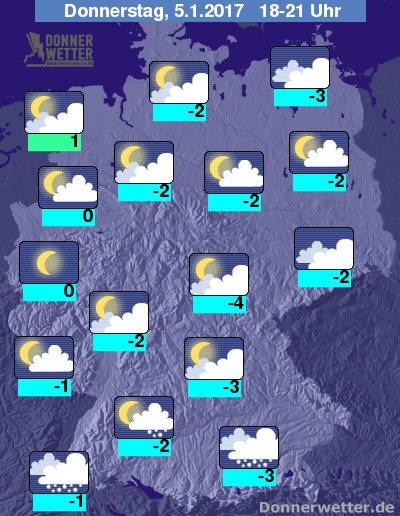 Auch am Abend befinden sich die Temperaturen fast landesweit unter dem Gefrierpunkt. Lediglich an der Nordsee werden noch Plusgrade gemessen. Die Schneefälle haben sich währenddessen auf den Süden des Landes konzentriert. Im Westen ist der Himmel hingegen meist sternenklar.