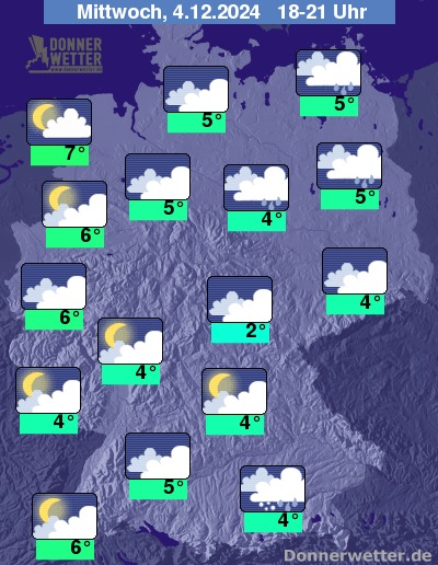 In der Nacht zum Donnerstag klingen auch im Osten die letzten Niederschläge ab, hier bleibt es aber meist bedeckt. Im übrigen Bundesgebiet ist es oft aufgelockert und sonst dicht bewölkt, jedoch trocken. Stellenweise kann sich Nebel bilden. Die Temperatur sinkt auf 4 Grad in Berlin und bis -1 Grad in Saarbrücken.