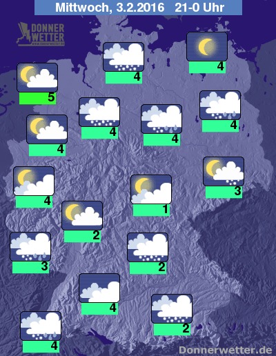 In der Nacht zum Donnerstag fällt vor allem im Alpenvorland noch häufig Schnee oder auch Schneeregen, dabei besteht Glättegefahr! In den anderen Landesteilen ist es unterschiedlich, häufig auch stark bewölkt, jedoch mehrheitlich trocken. Die Temperatur sinkt auf 4 Grad in Ostfriesland und bis -1 Grad im Vogtland. An den Küsten weht zum Teil starker Wind.
